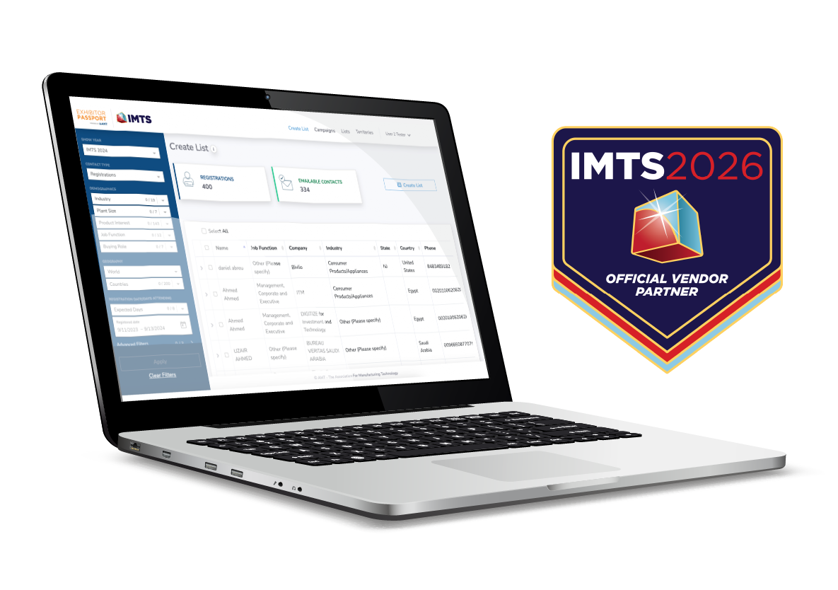 Exhibitor Passport offers exclusive access to verified, detailed registrant information from class-leading manufacturing events like IMTS. Filter through attendees’ product interests, buying roles, equipment budgets, and much more to discover your ideal customer. By targeting your marketing campaigns, you’ll build your brand, increase interest, and ultimately achieve greater ROI.